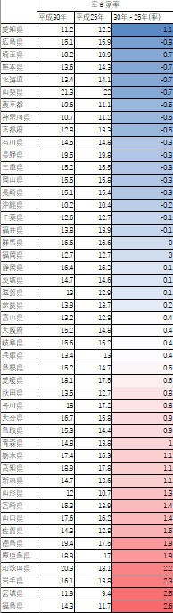 平成25年と平成30年の空き家率の変動をリストしてみると、愛知県が-1.1%(空き家率が1.1%減少)、広島県が0.8%現象、埼玉県、熊本県、北海道、山梨県が-0.7%となっています。逆に、空き家率が増加している都道府県は、福島県が2.6%、宮城県が2.5%、岩手県が2.3%と東北地方の増加がみられます。
